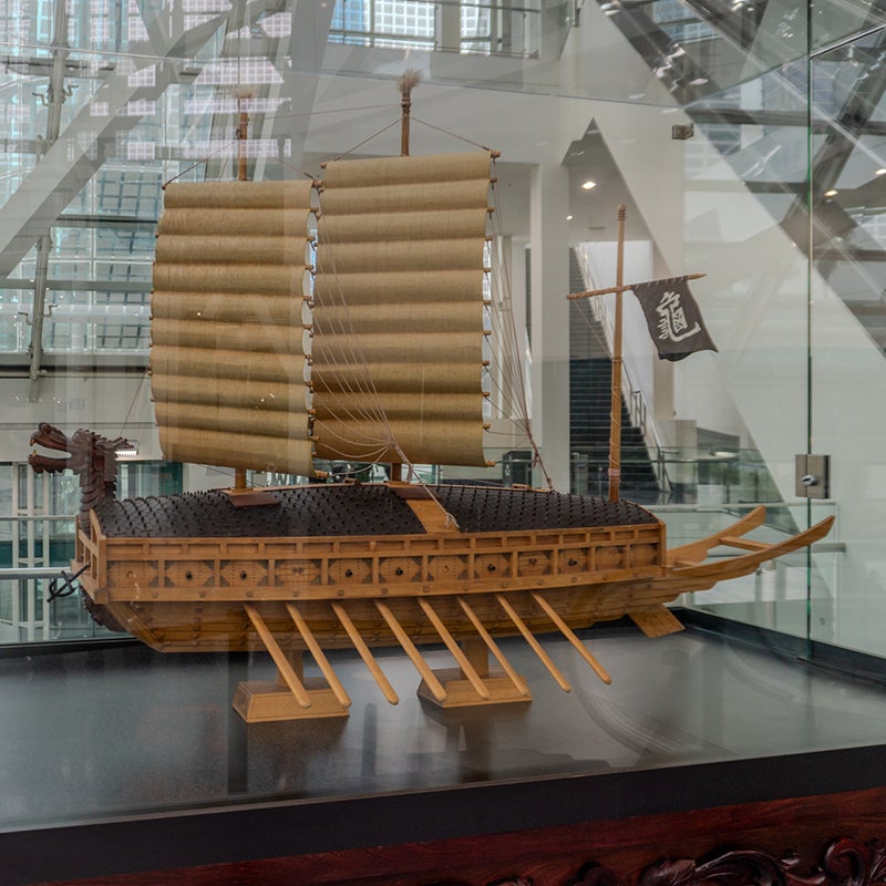 In 1993, artist Alexis Smith designed expansive terrazzo floor installations for the LACC's lobbies. The West Lobby features an 18,000-square-foot depiction of the night sky, with the lower level showcasing Earth's edge, highlighting North America under a dark sky with a crescent moon. The upper level presents an accurate Milky Way star map, aligned with the lobby's architectural grid, using terrazzo with crushed marble and mother of pearl for sparkle. In the South Lobby, Smith created a 45,000-square-foot terrazzo map of the Pacific Rim, incorporating ethnic medallions based on authentic designs.